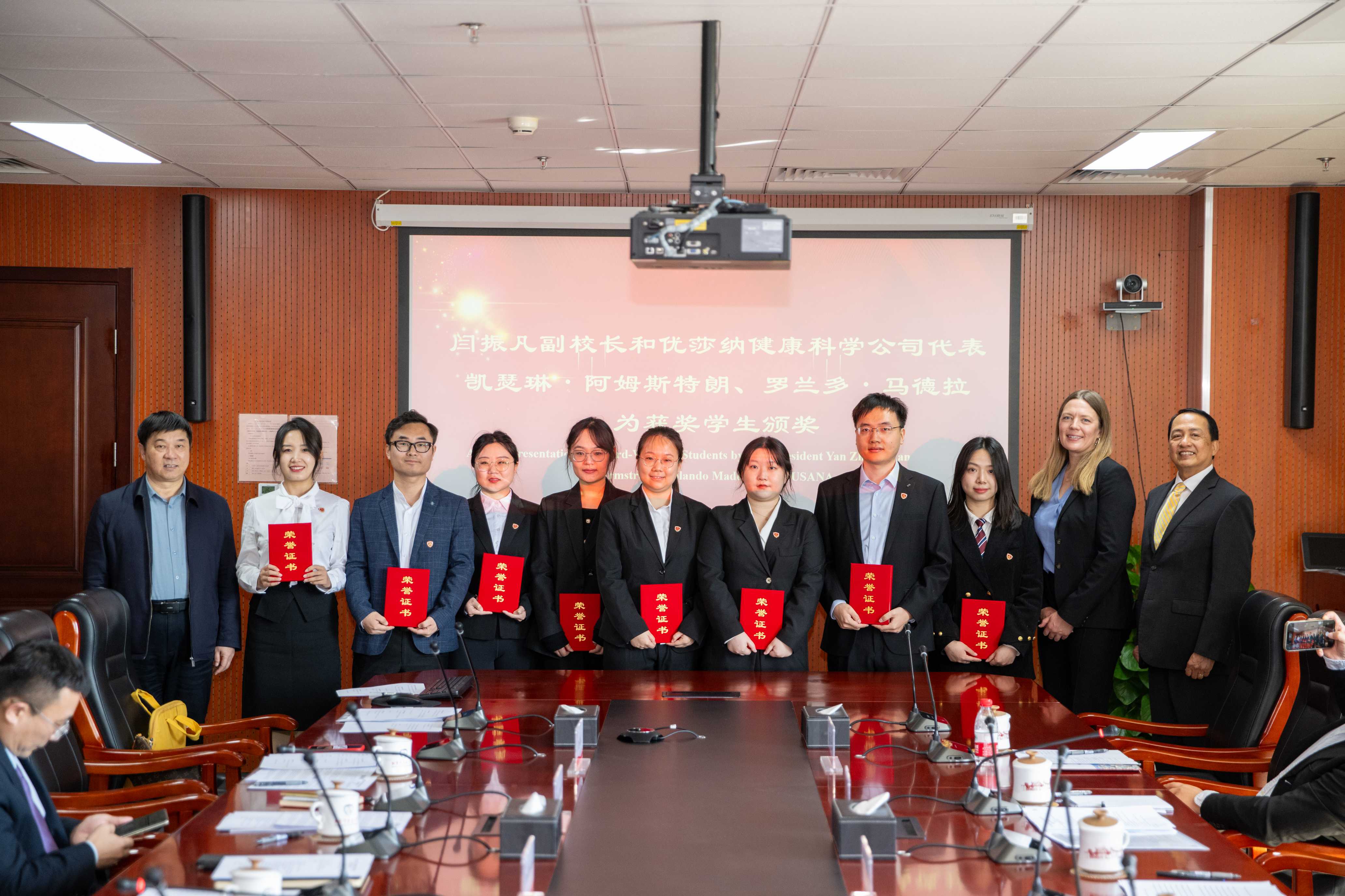 在热烈的掌声中,闫振凡副校长与优莎纳代表共同为15位获奖博士生颁发优莎纳博士国奖提名奖证书。赵建磊部长为优莎纳健康科学公司颁发鸣谢牌,向捐赠者表示了衷心感谢。