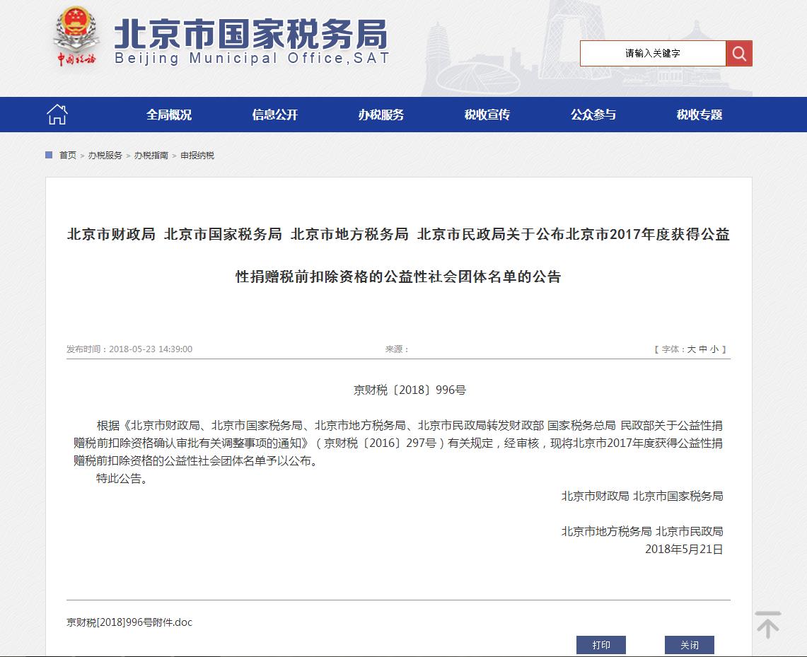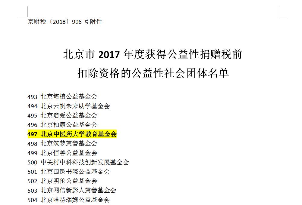 5月23日,北京市国家税务局官网公布了2017年度获得公益性捐赠税前扣除资格的公益性社会团体名单,我校教育基金会获得2017年度公益性捐赠税前扣除资格。