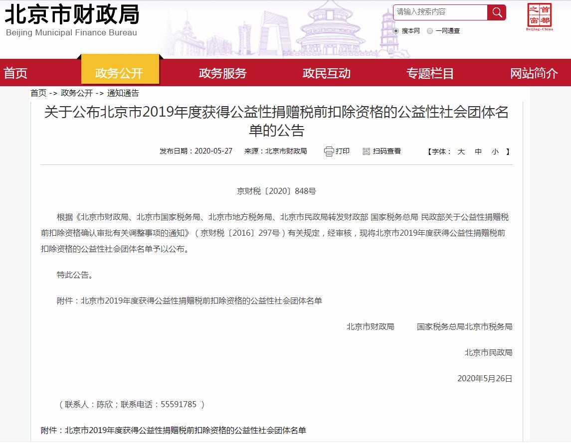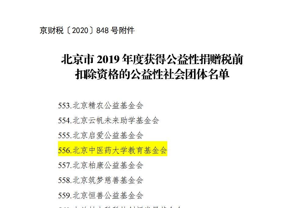 2020年5月26日,北京市财政局、国家税务总局北京市税务局、北京市民政局发布《关于公布北京市2019年度获得公益性捐赠税前扣除资格的公益性社会团体名单的公告》(京财税〔2020〕848号),我校教育基金会获得2019年度公益性捐赠税前扣除资格,标志着企业或个人2019年捐赠给我校教育基金会的支出,凭借基金会开具的公益事业捐赠统一发票,均可按规定享受税前扣除。