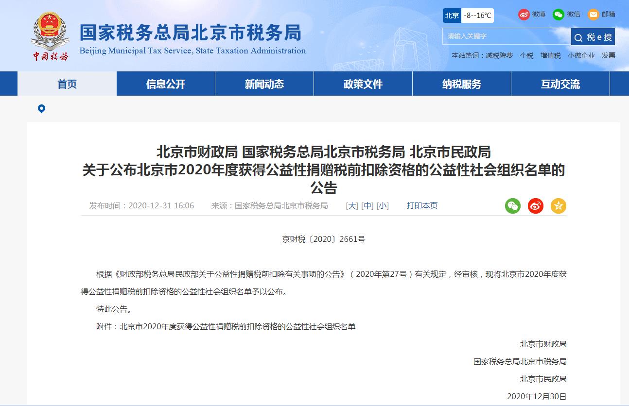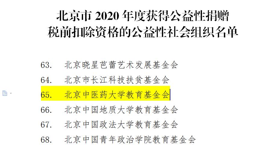 2020年12月30日,北京市财政局、国家税务总局北京市税务局、北京市民政局发布《关于公布北京市2020年度获得公益性捐赠税前扣除资格的公益性社会组织名单的公告》(京财税〔2020〕2661号),其中,世界杯网址教育基金会获得公益性捐赠税前扣除资格,有效期限为3年。根据《财政部 税务总局 民政部关于公益性捐赠税前扣除有关事项的公告》(2020年第27号)有关规定,标志着2020年1月1日至2022年12月31日期间向我校基金会进行捐赠的企业或个人,凭借基金会开具的公益事业捐赠统一发票,均可按规定享受税前扣除。